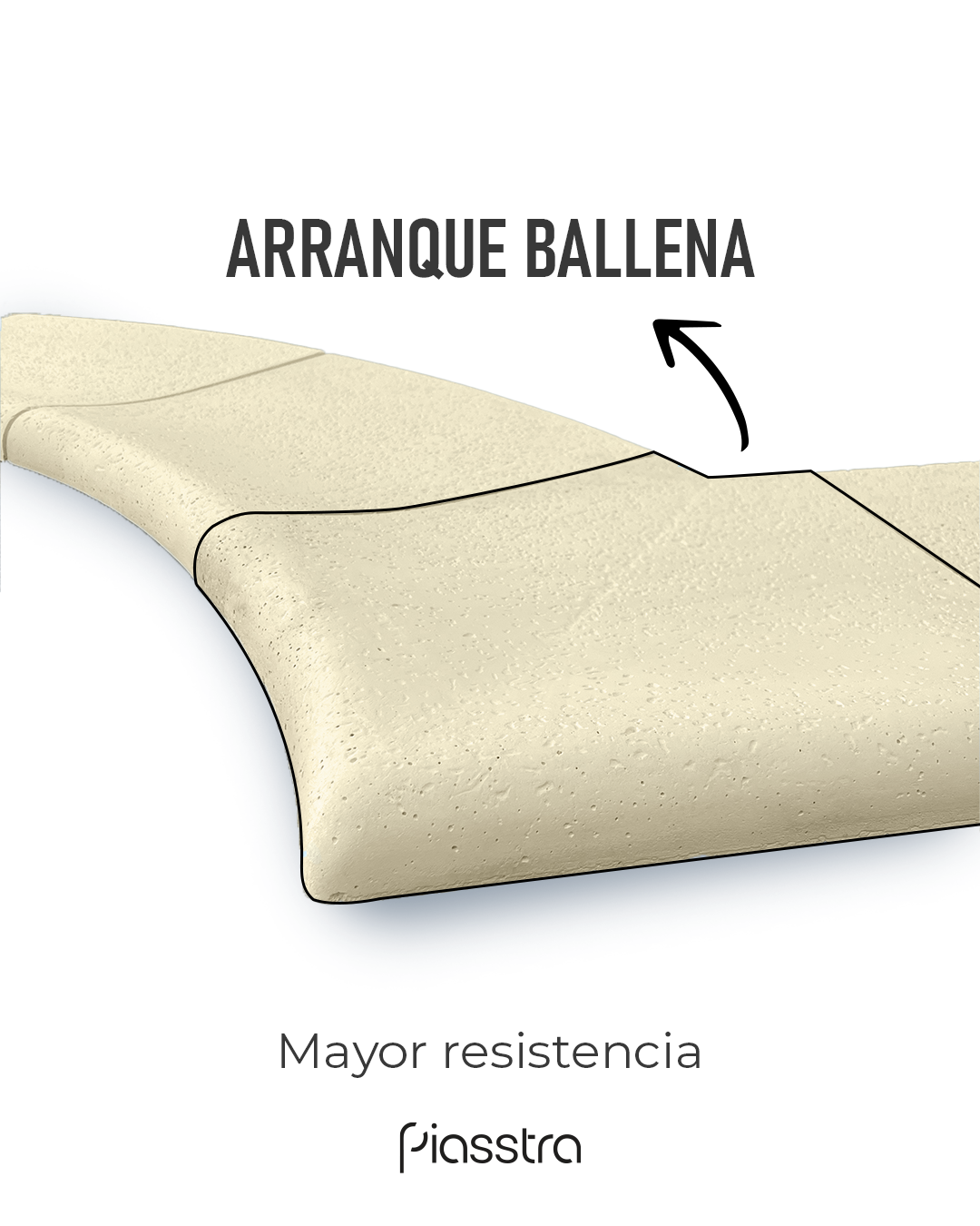 Su diseño tipo ballena aporta una terminación más suave y ergonómica en el borde, elevando tanto la estética como la funcionalidad del entorno de la piscina.